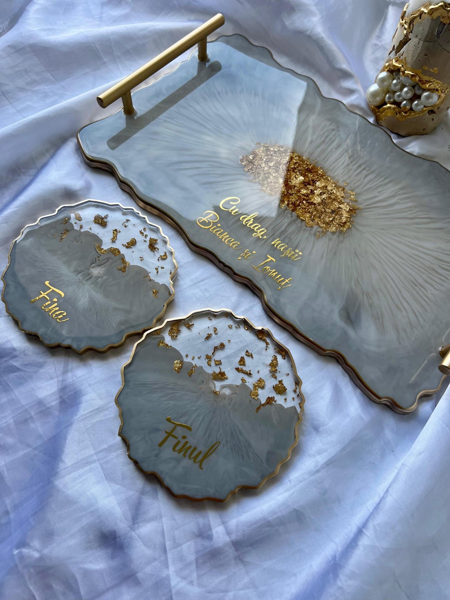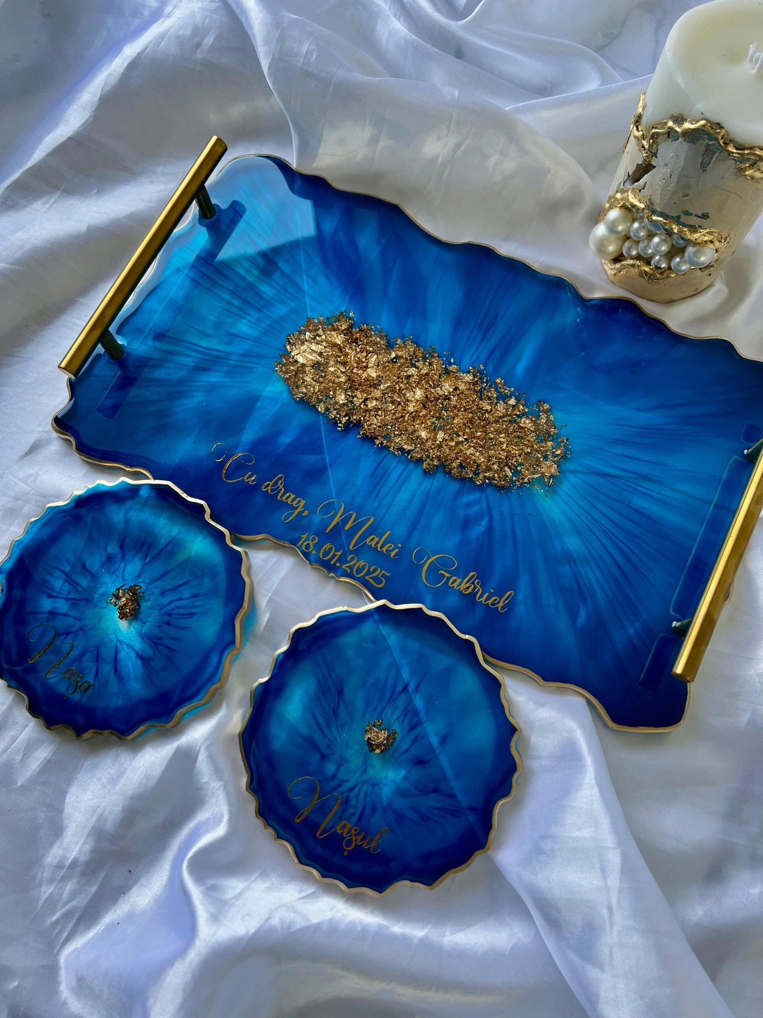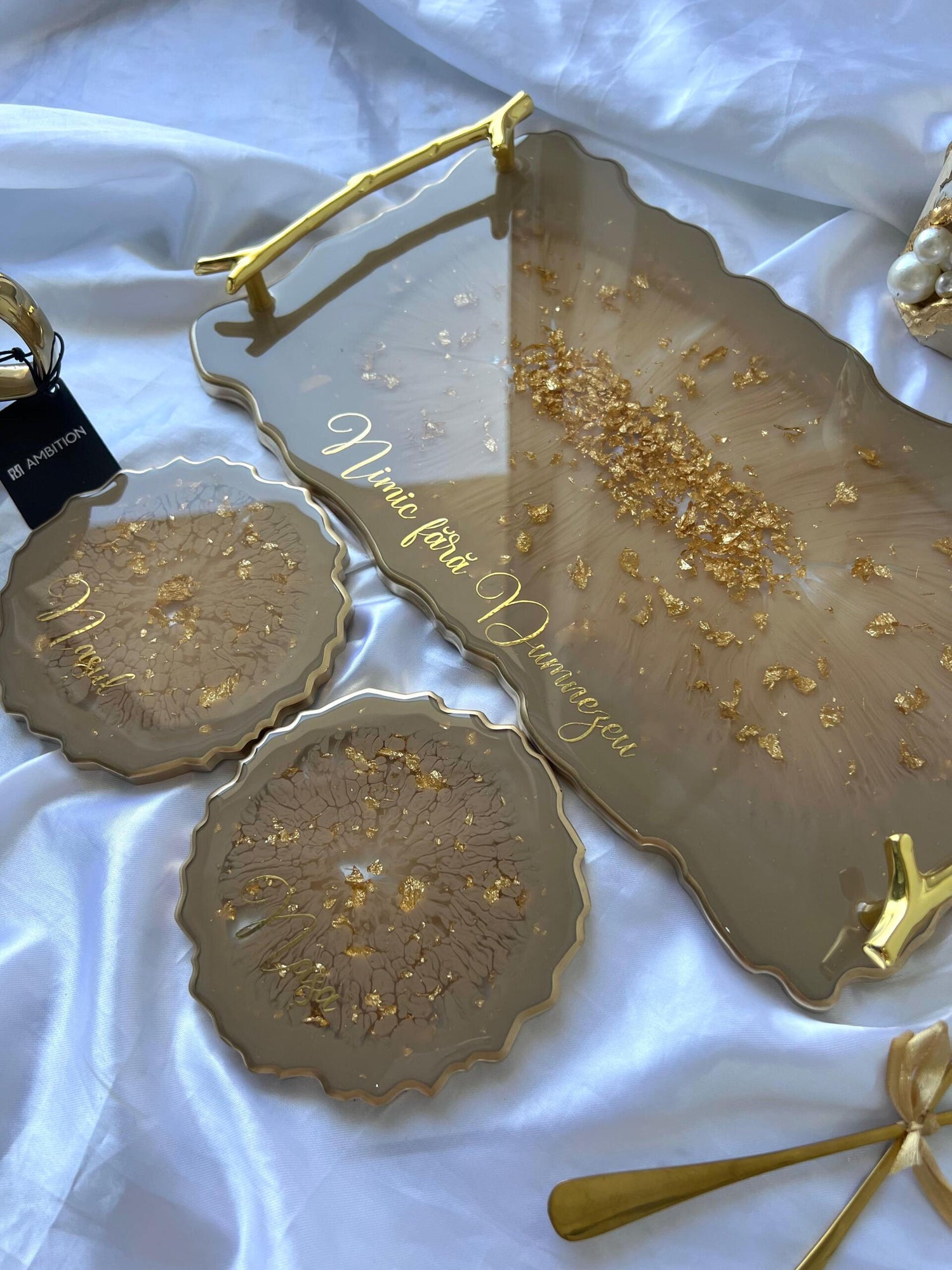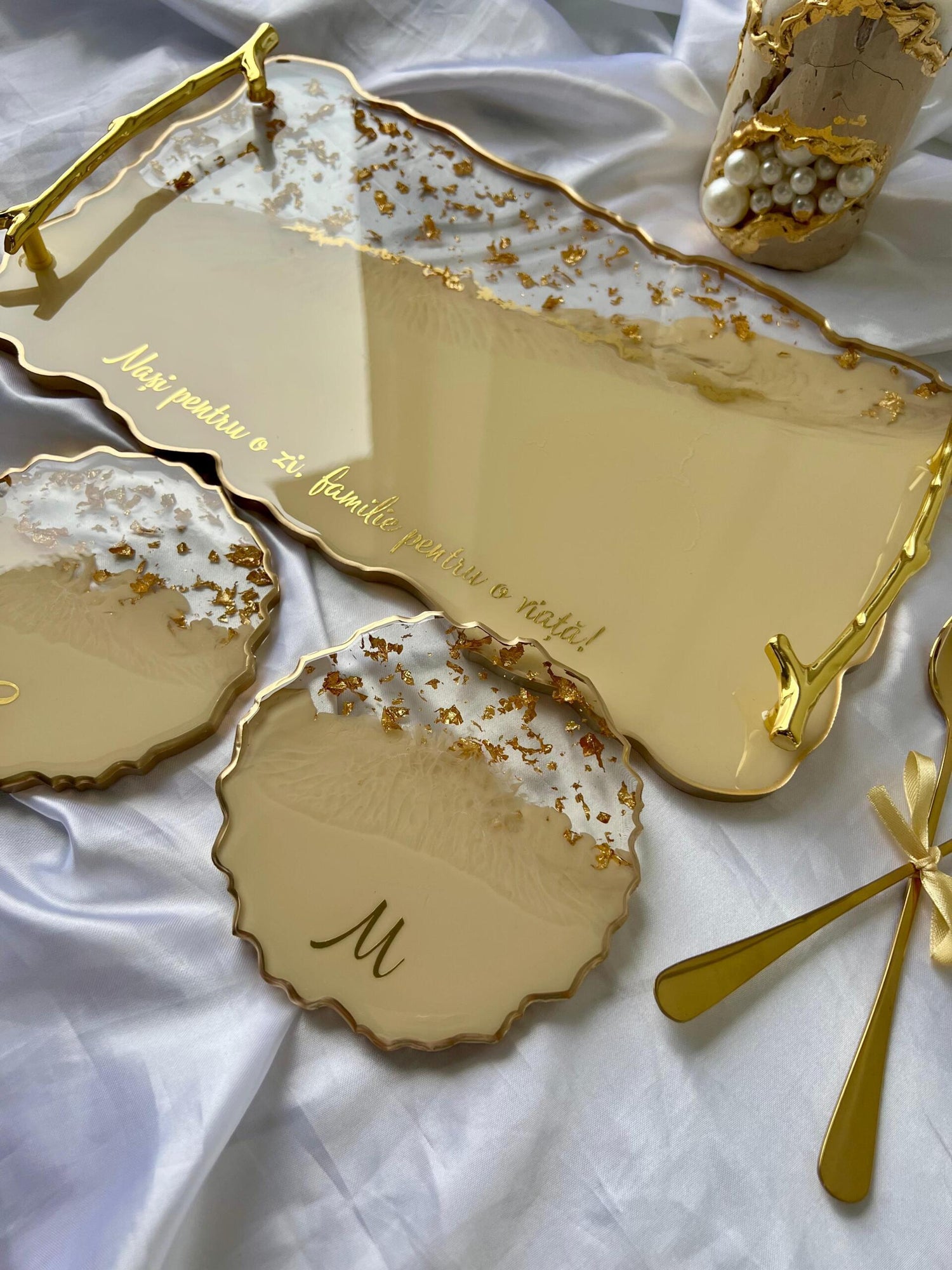 Tăviță din rășină cristal handmade cu foiță de aur – cadou personalizat și decor lux