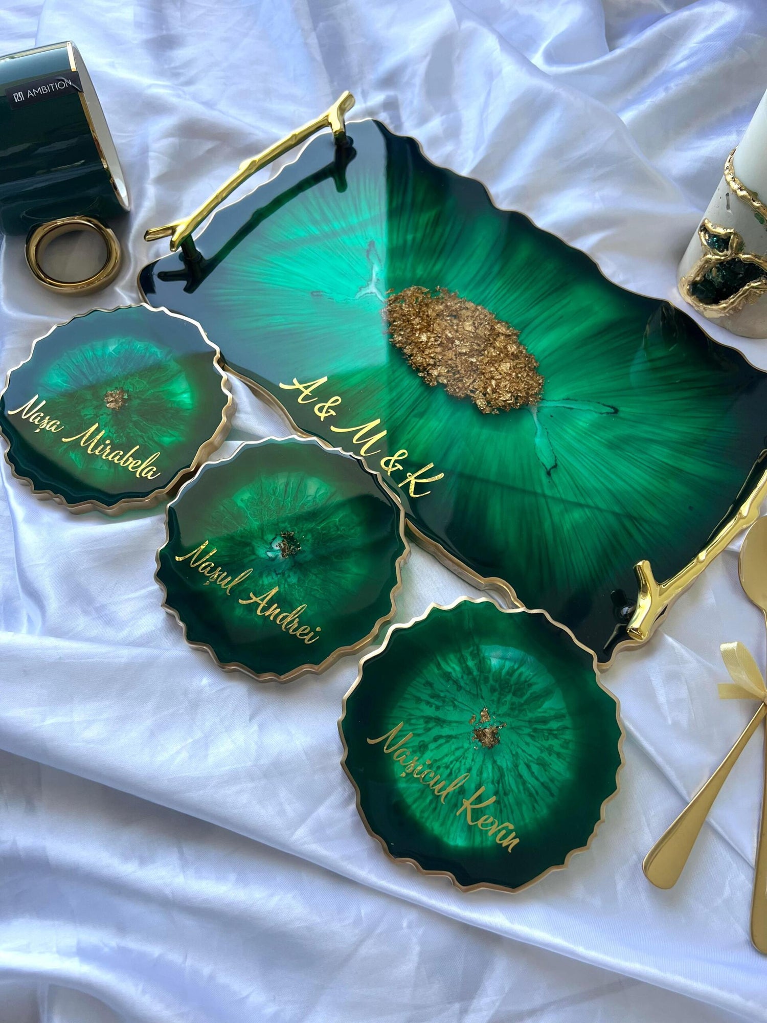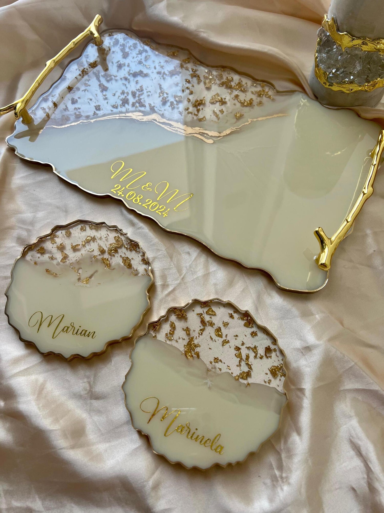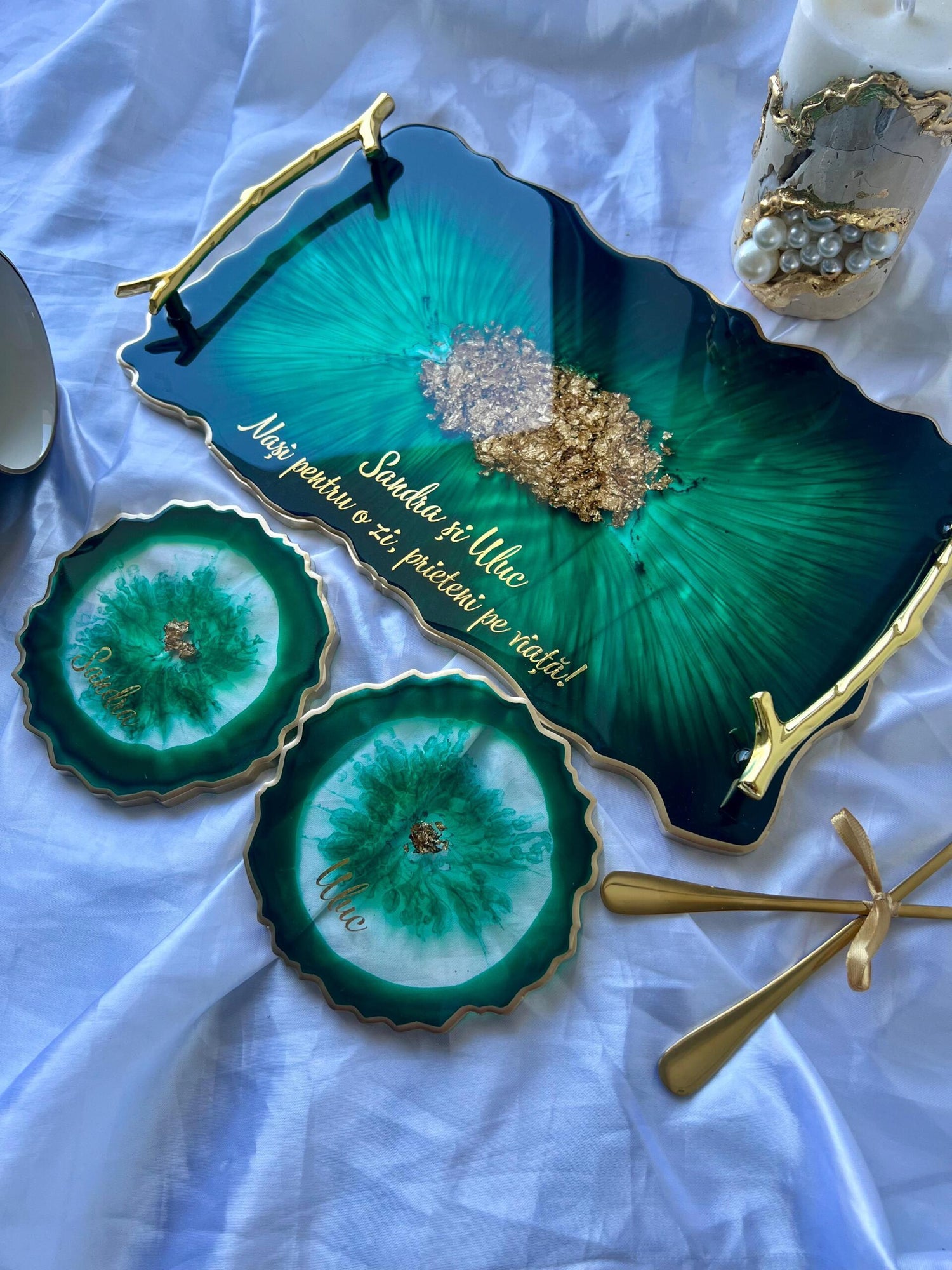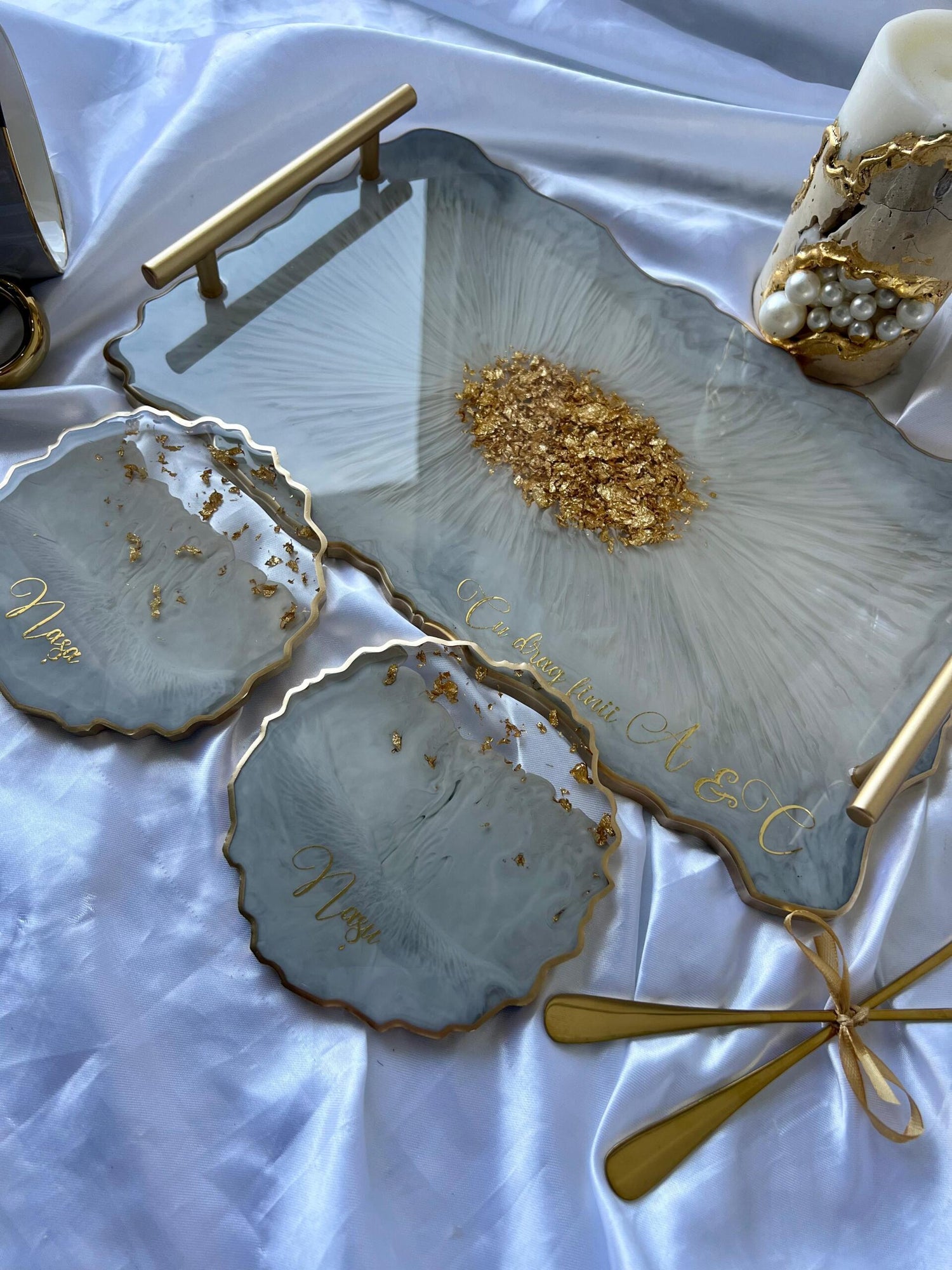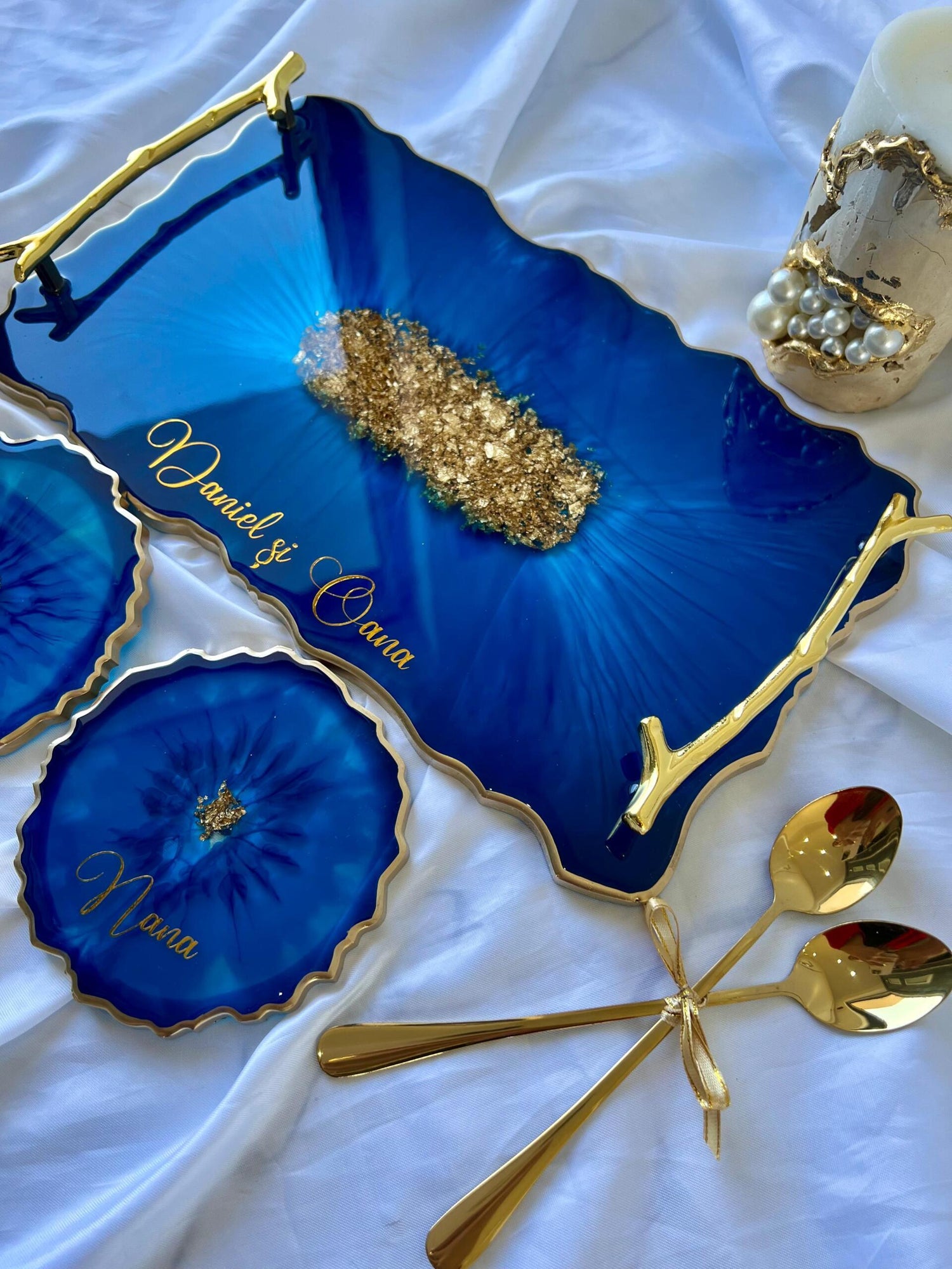 Tăviță din rășină cristal handmade cu foiță de aur – cadou personalizat și decor lux