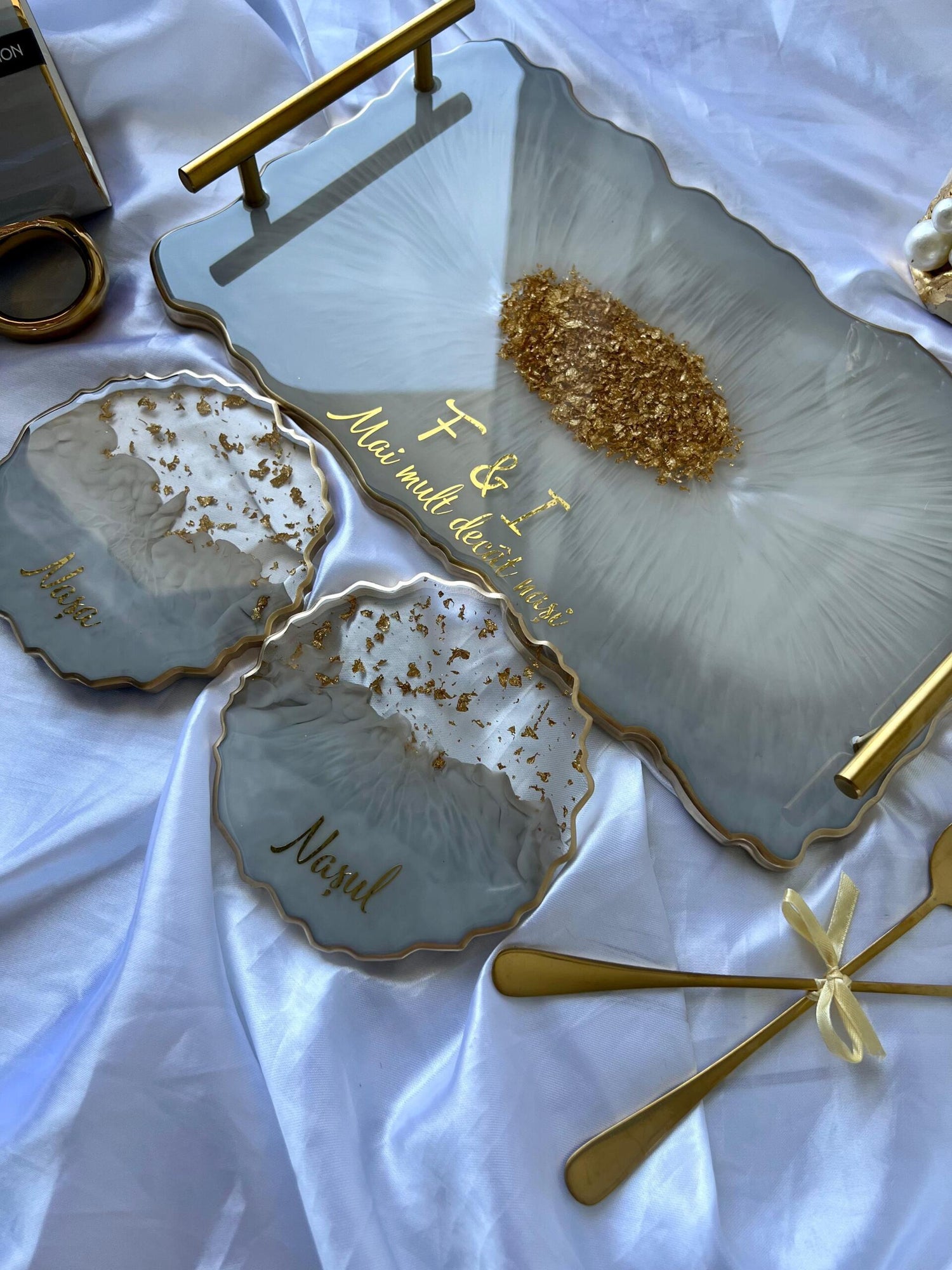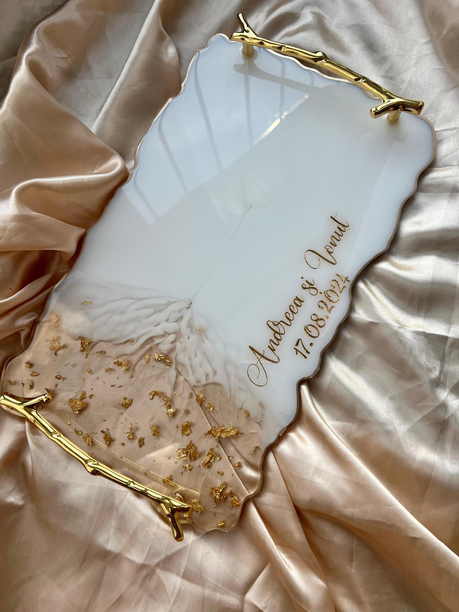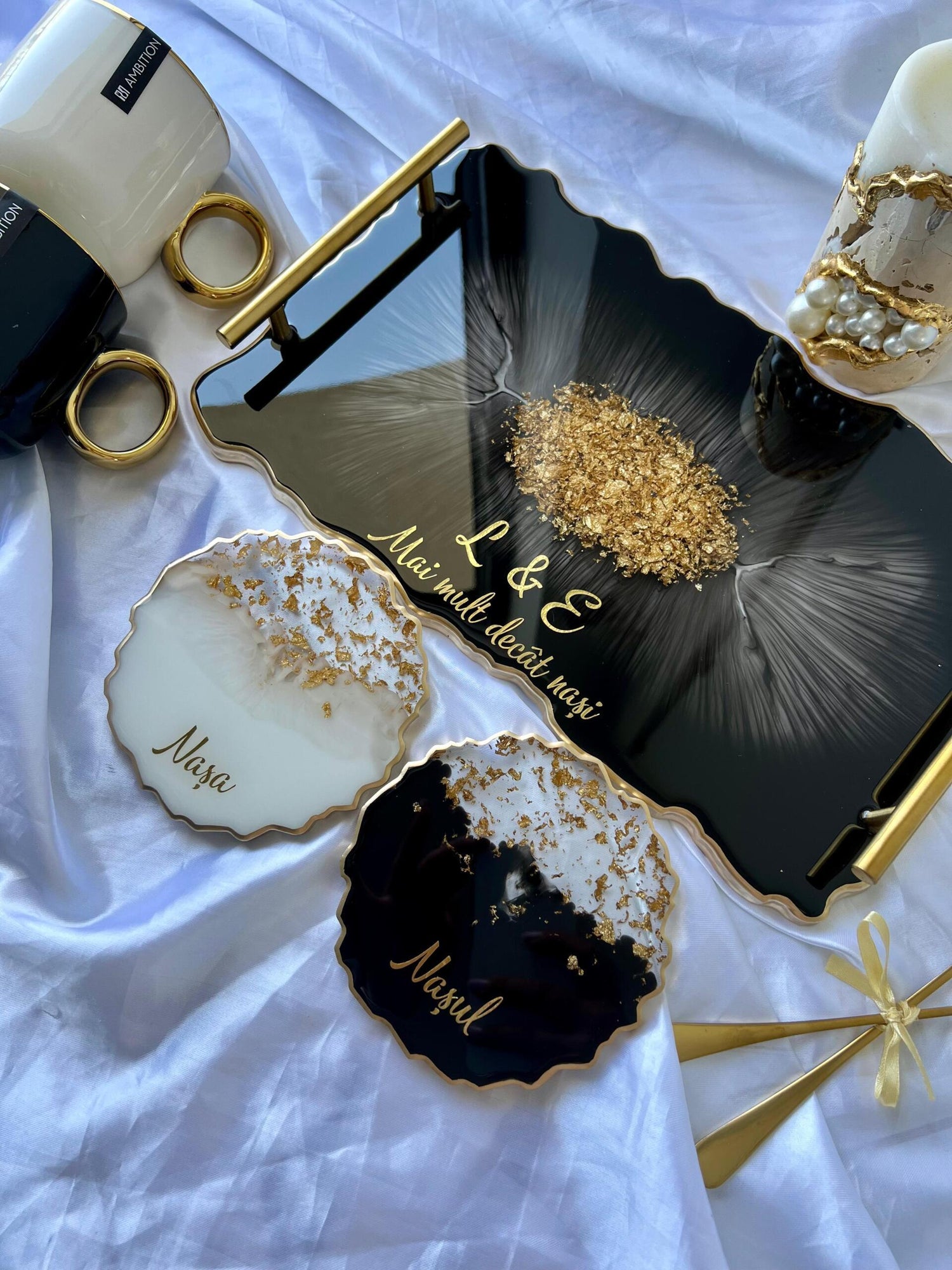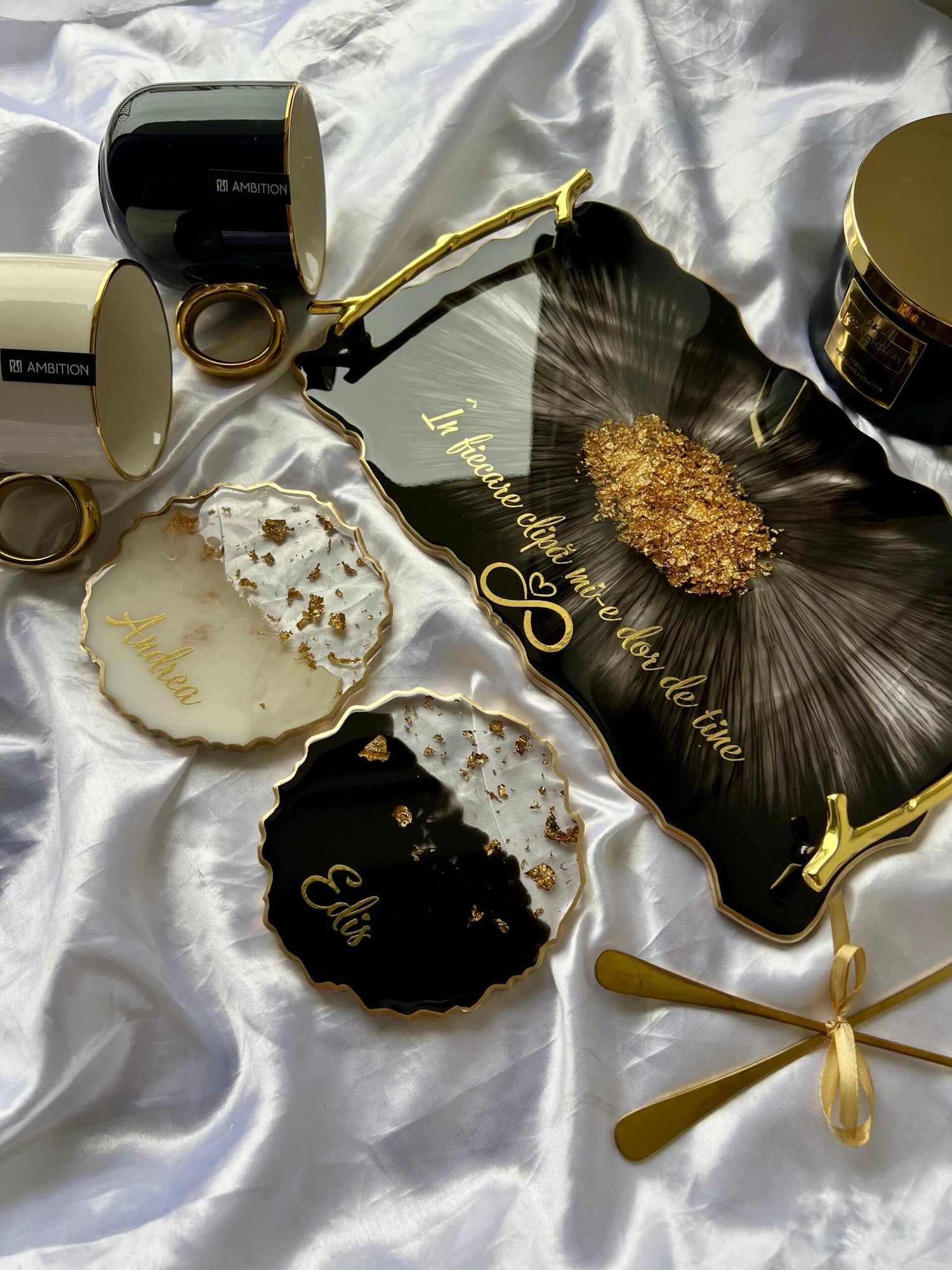Comandă simplu prin Instagram, Facebook sau WhatsApp, iar această tăviță din rășină cu foiță de aur va deveni un decor memorabil sau un cadou de impact, realizat cu atenție, pentru cei dragi sau pentru tine.