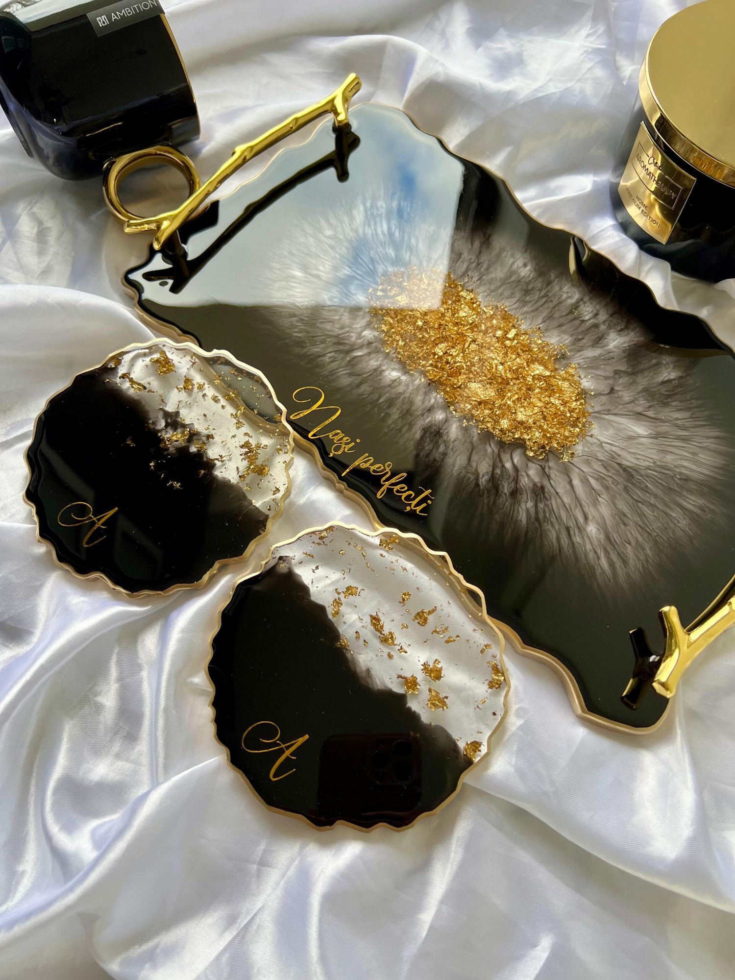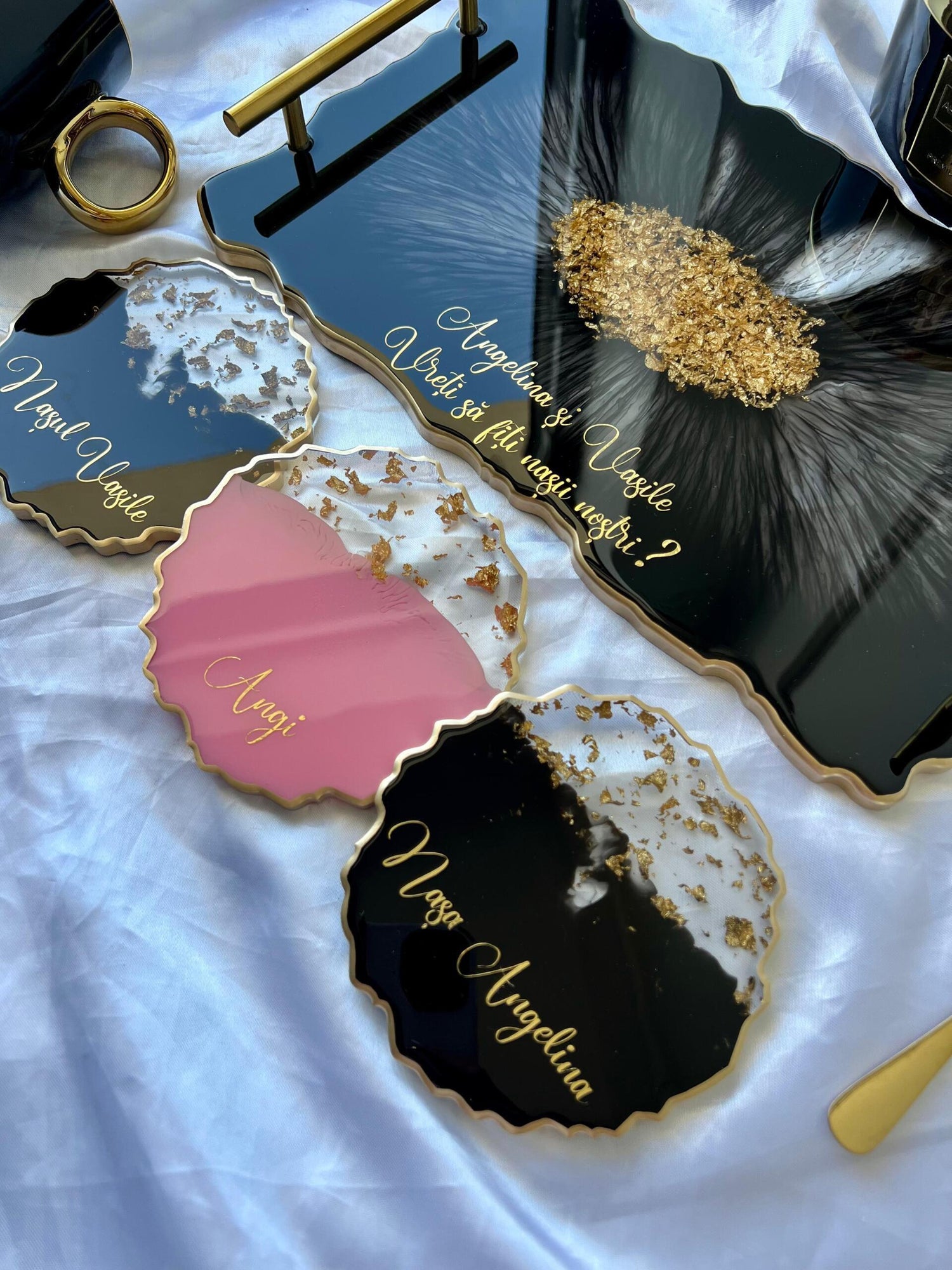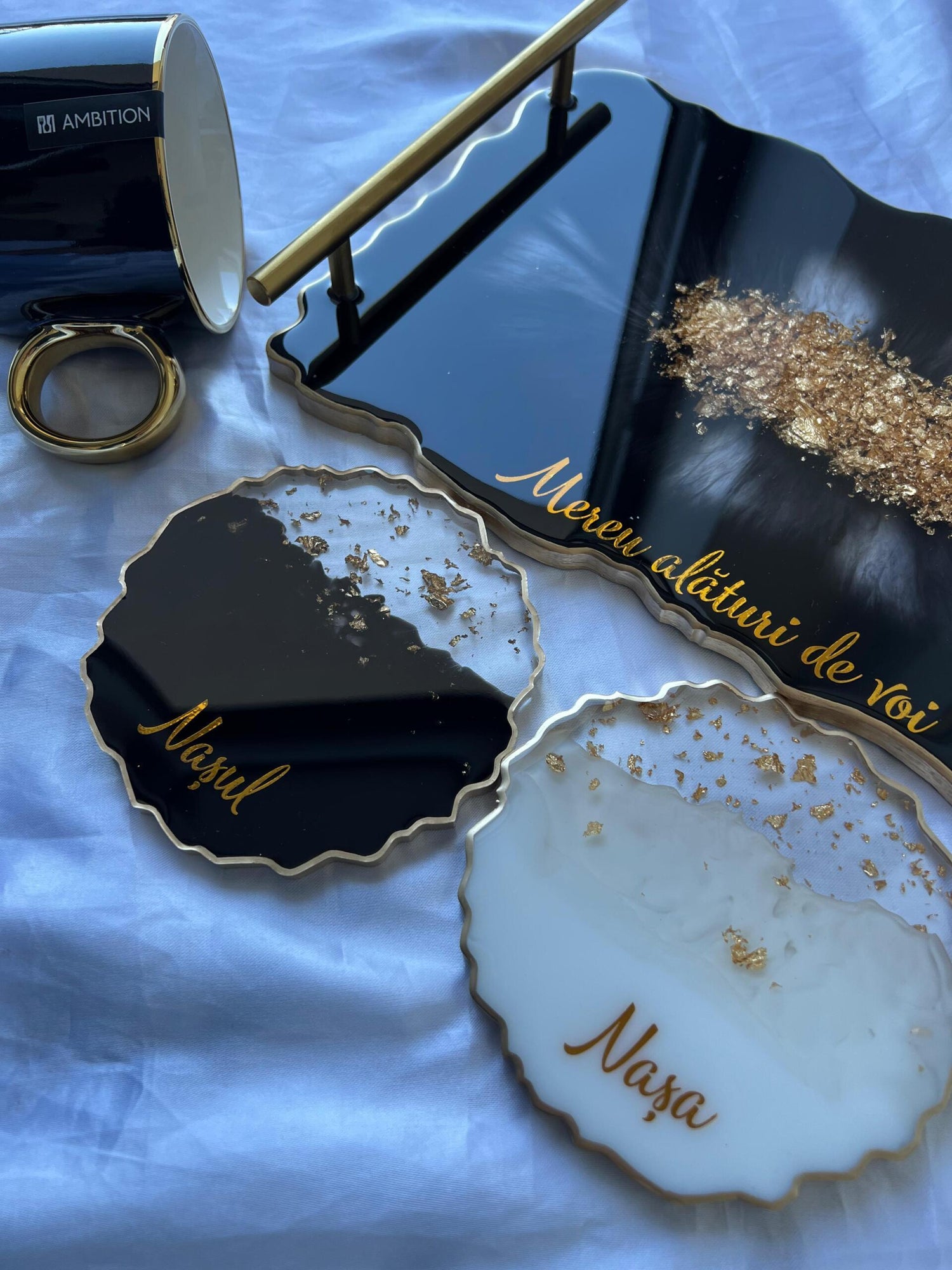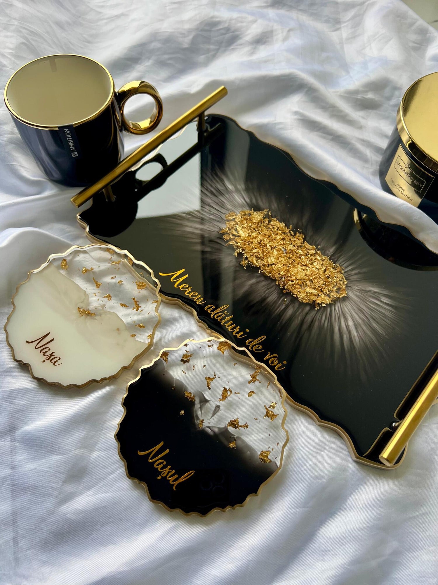 Comandă simplu prin Instagram, Facebook sau WhatsApp, iar această tăviță din rășină cu foiță de aur va deveni un decor memorabil sau un cadou de impact, realizat cu atenție, pentru cei dragi sau pentru tine.