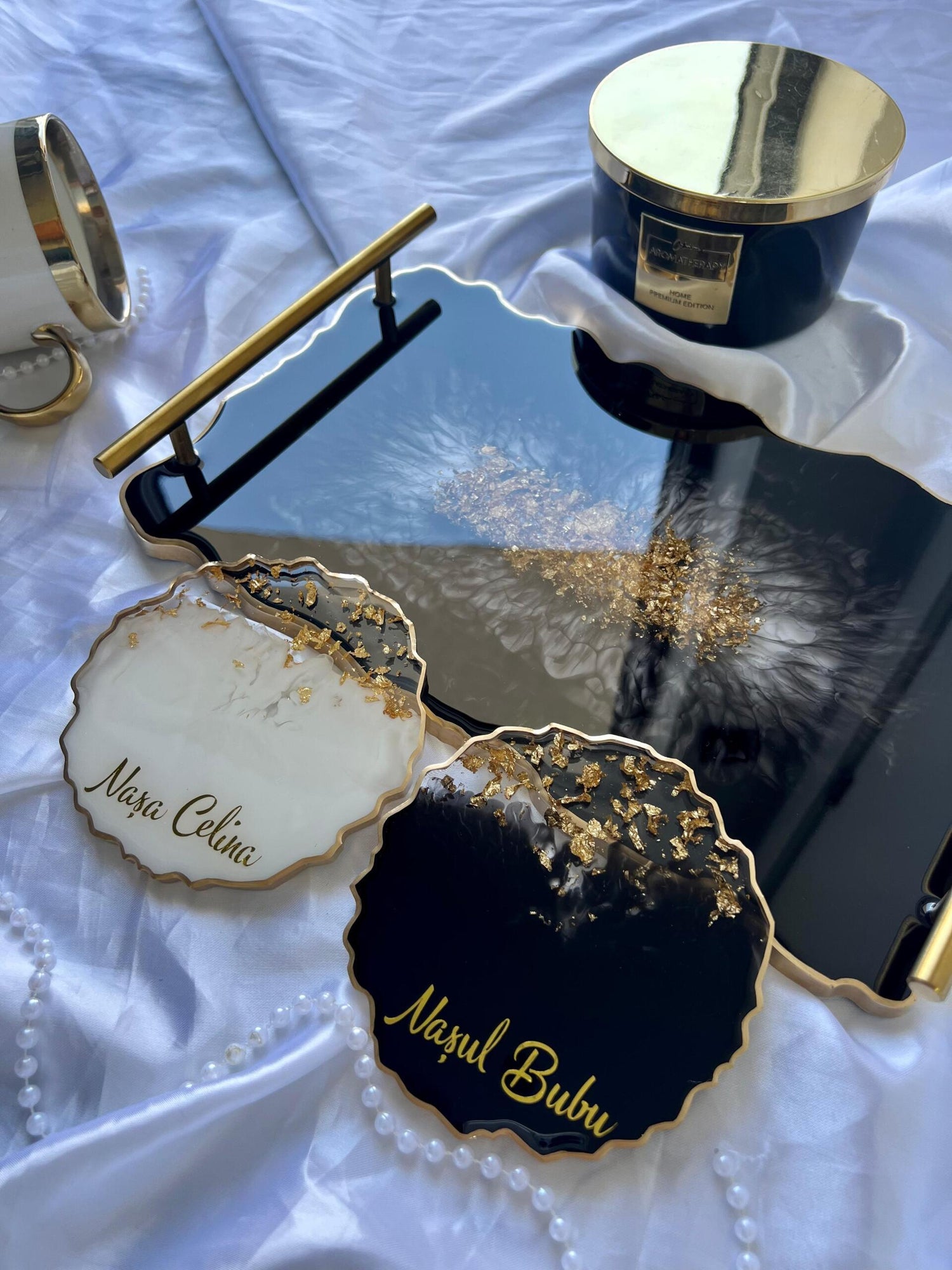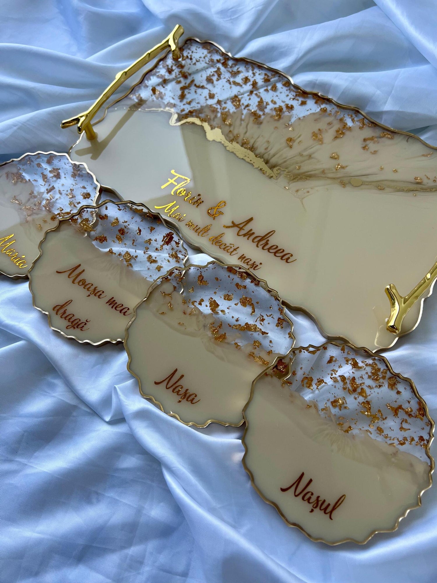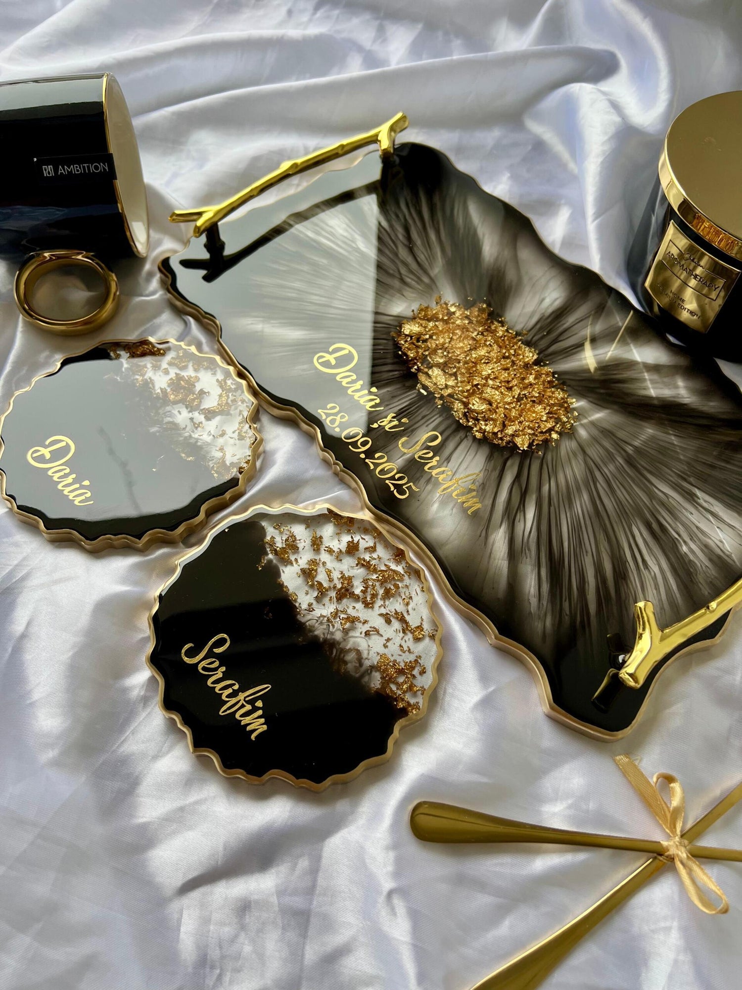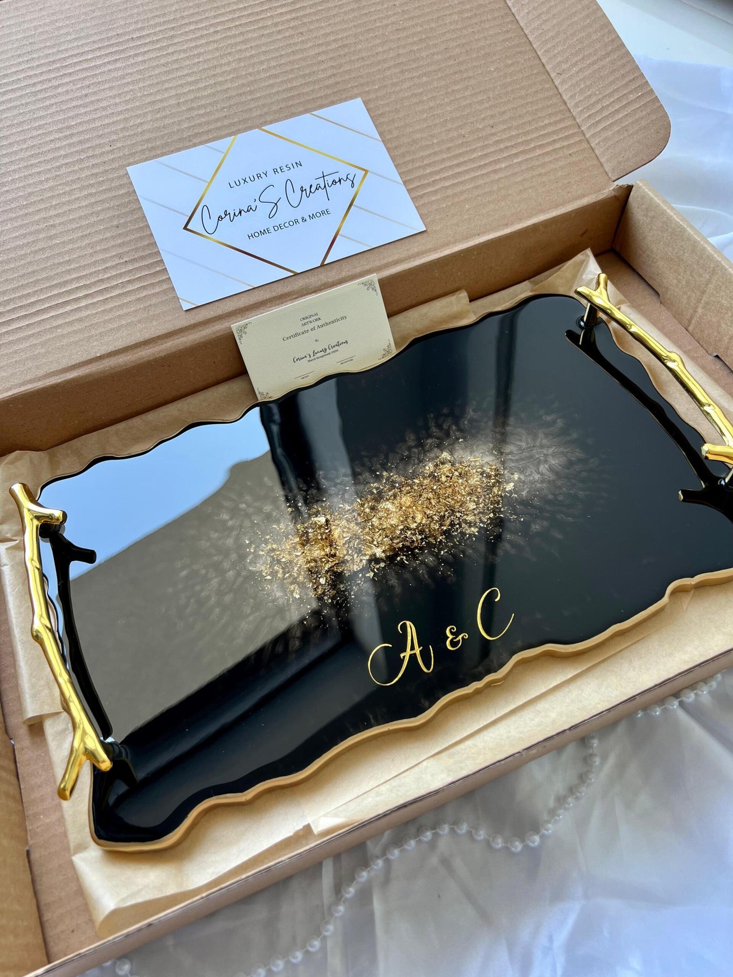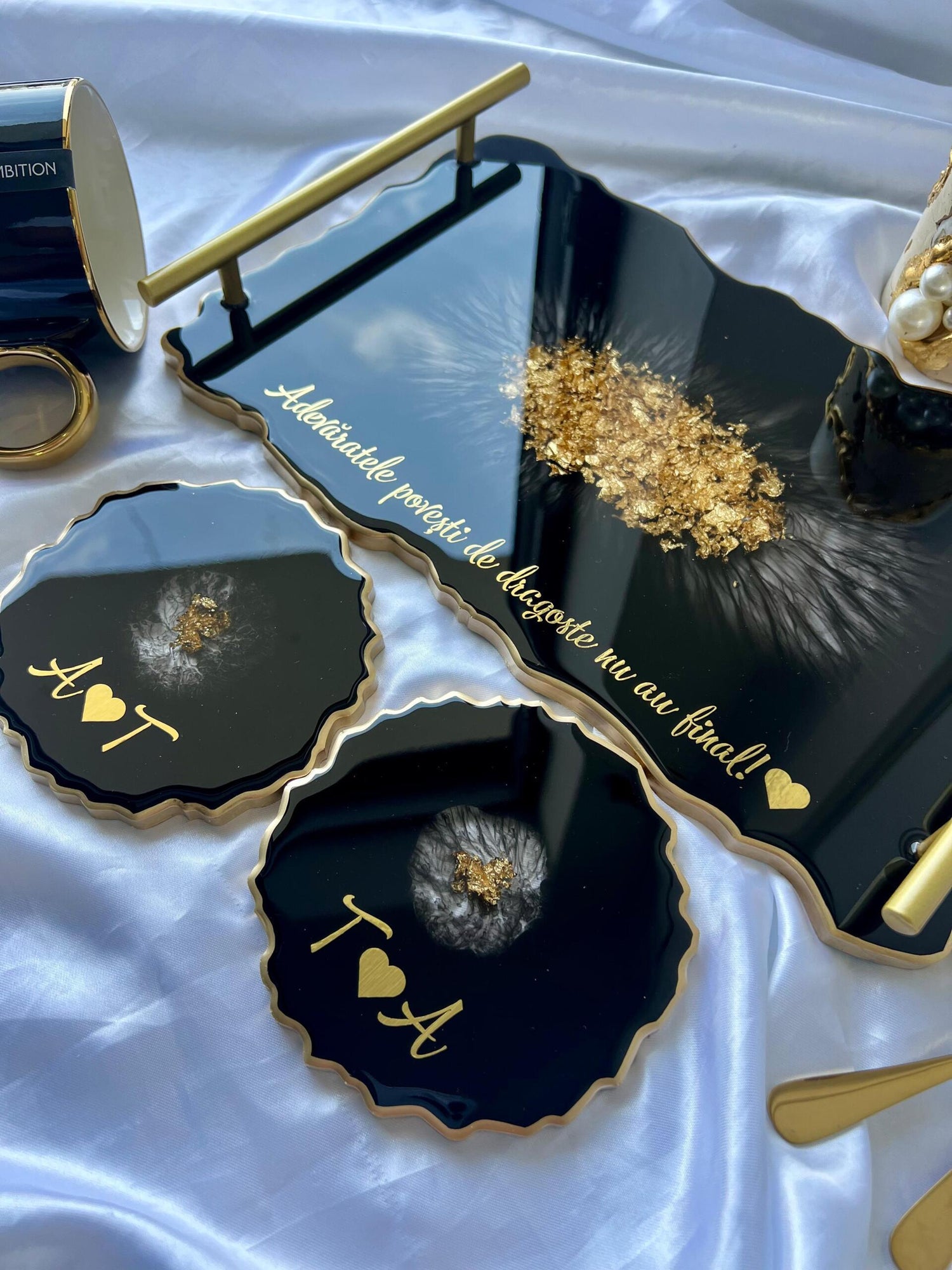 Comandă simplu prin Instagram, Facebook sau WhatsApp, iar această tăviță din rășină cu foiță de aur va deveni un decor memorabil sau un cadou de impact, realizat cu atenție, pentru cei dragi sau pentru tine.