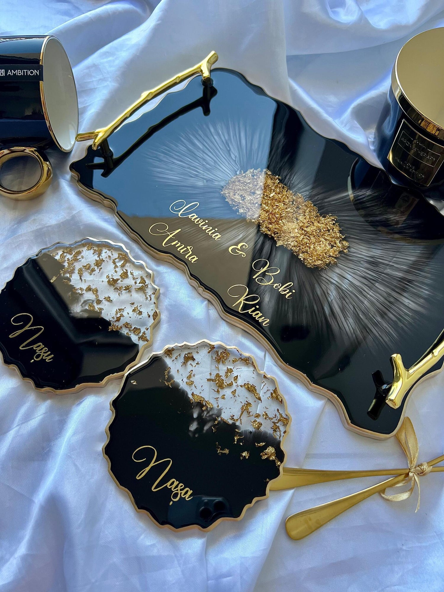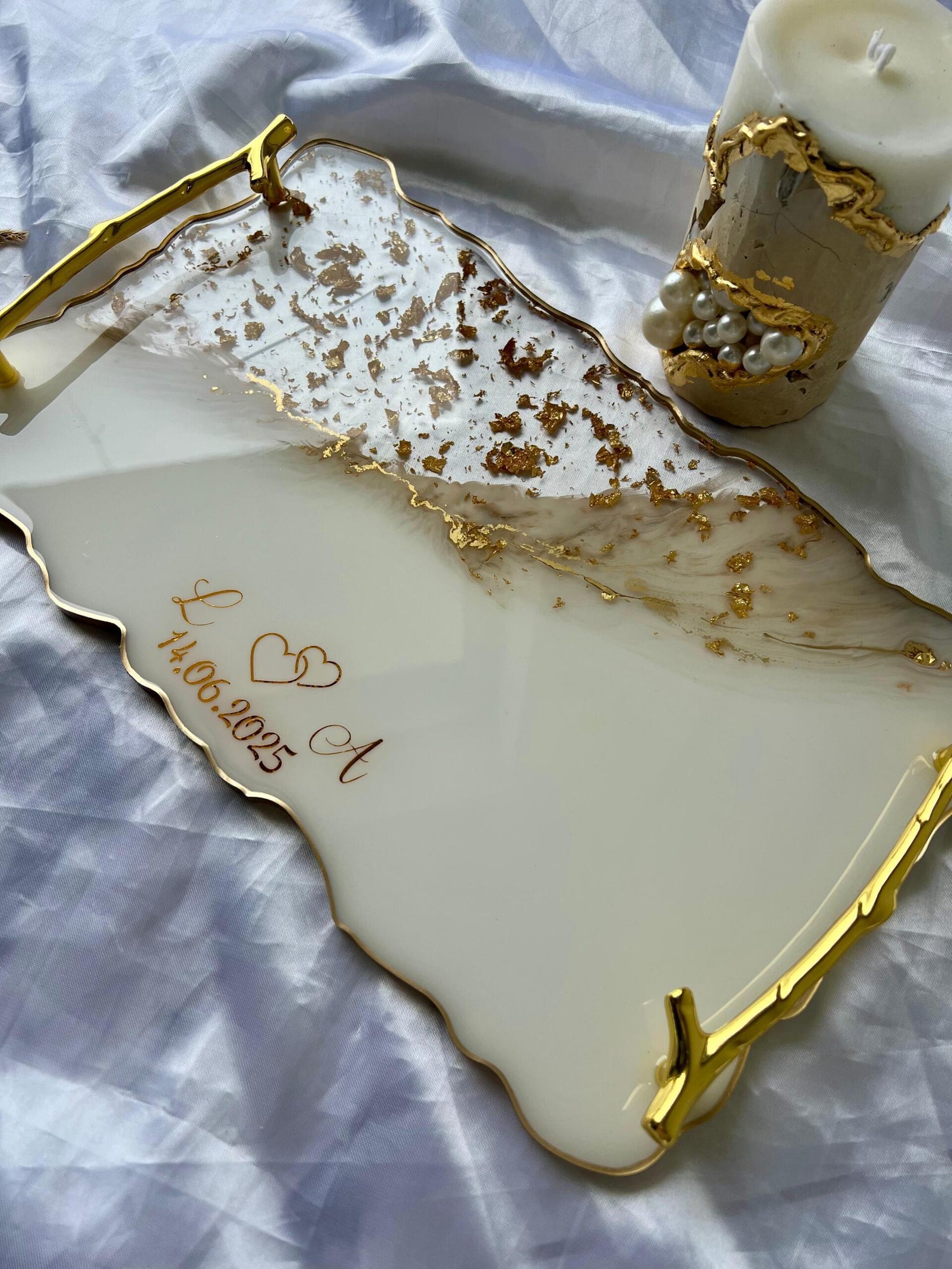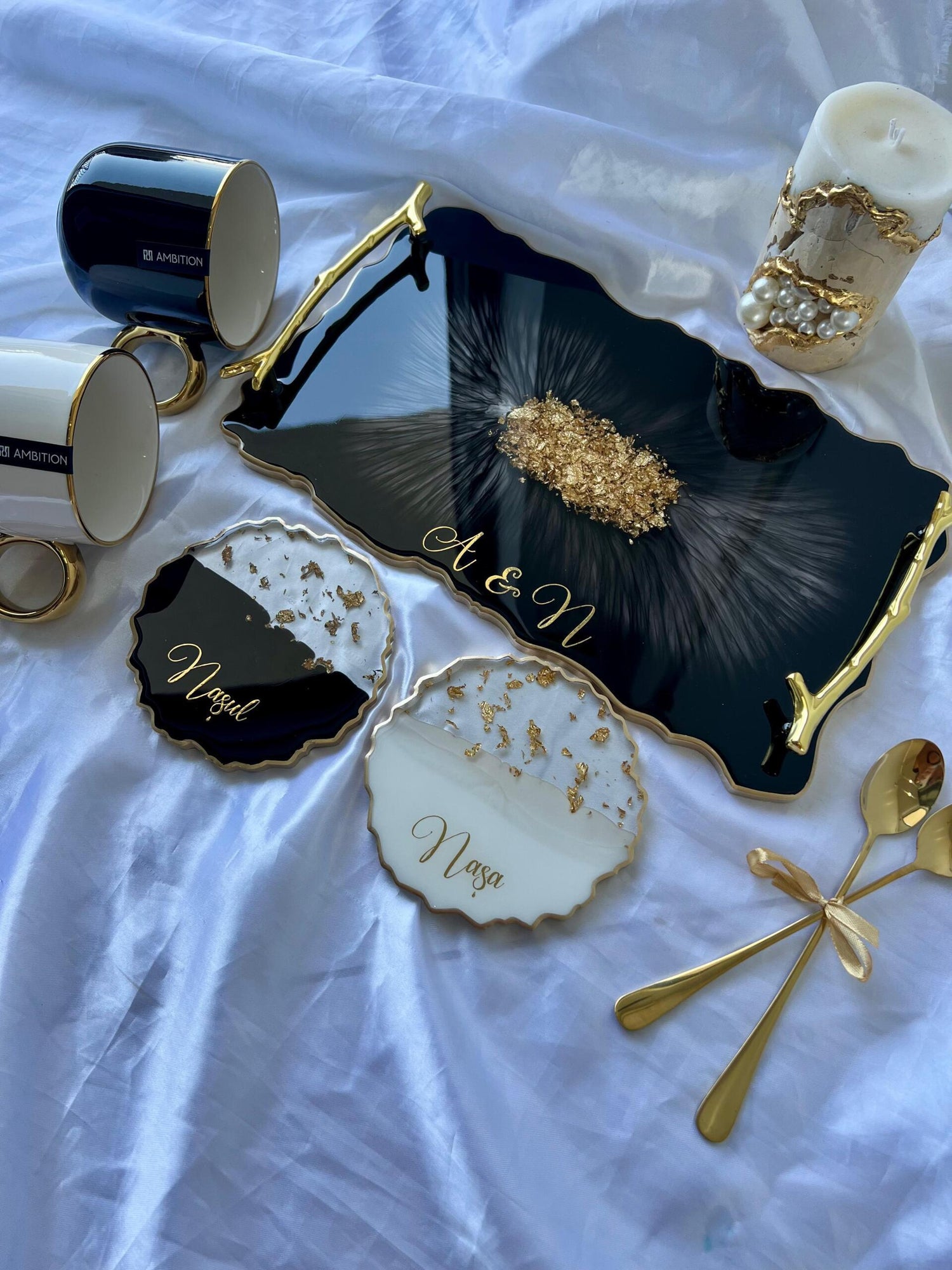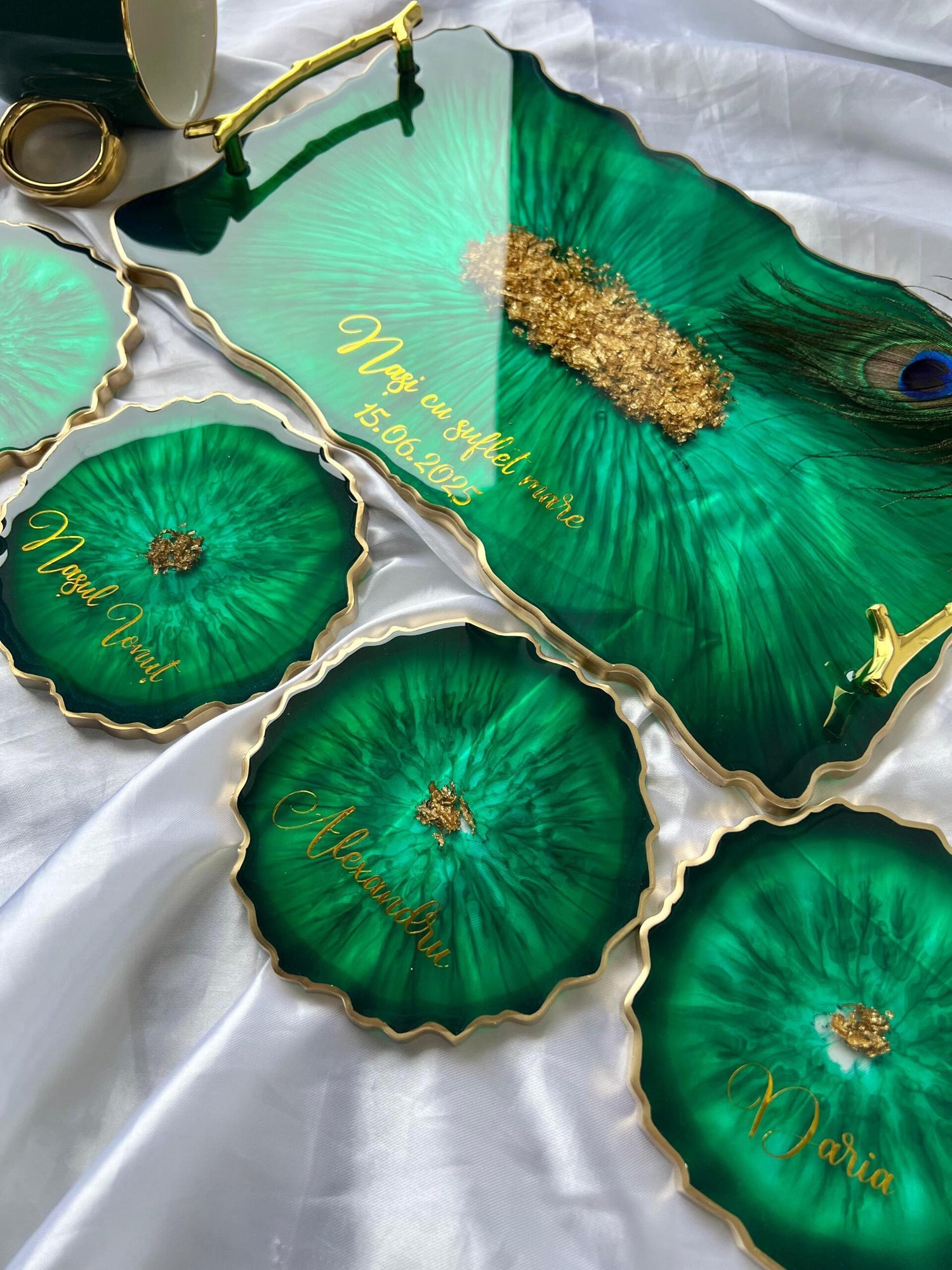 Comandă simplu prin Instagram, Facebook sau WhatsApp, iar această tăviță din rășină cu foiță de aur va deveni un decor memorabil sau un cadou de impact, realizat cu atenție, pentru cei dragi sau pentru tine.