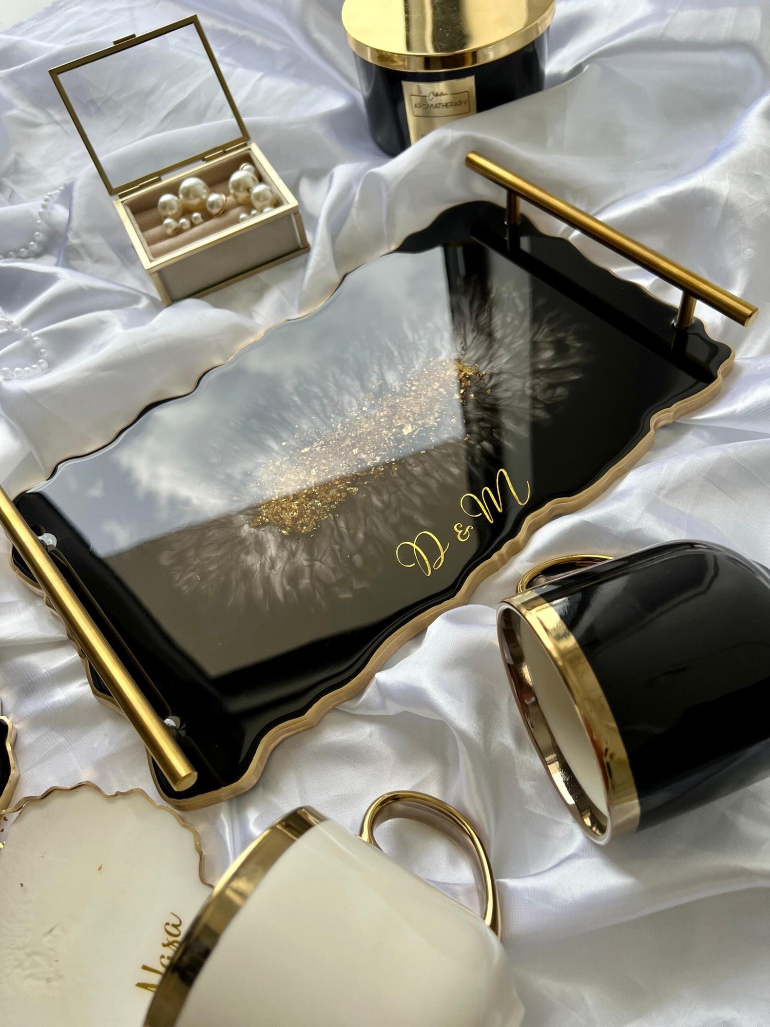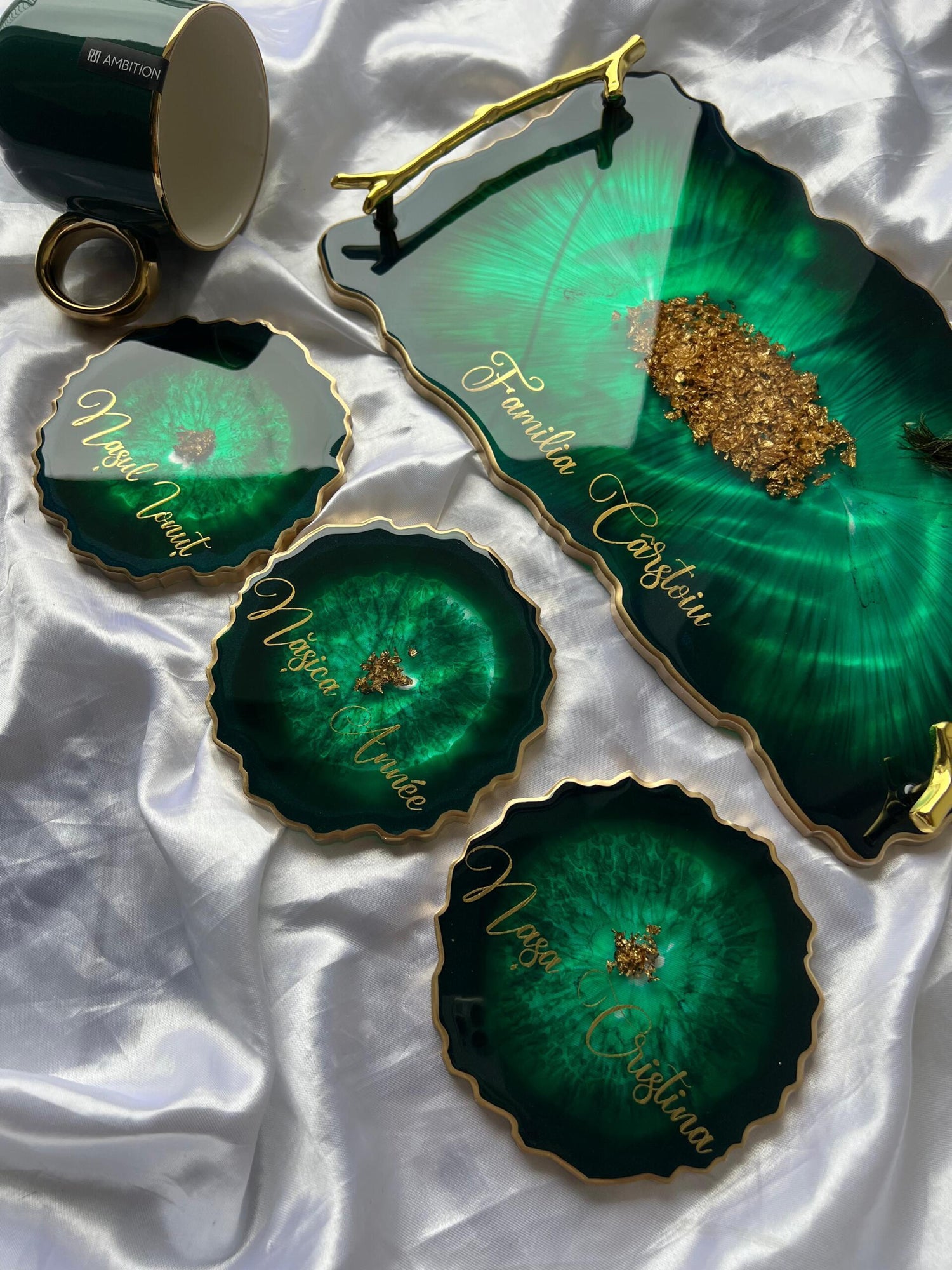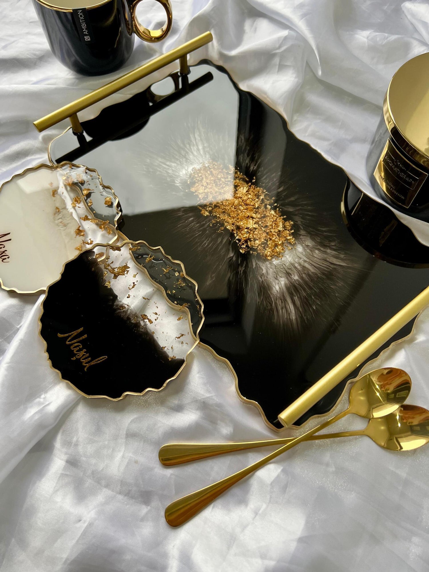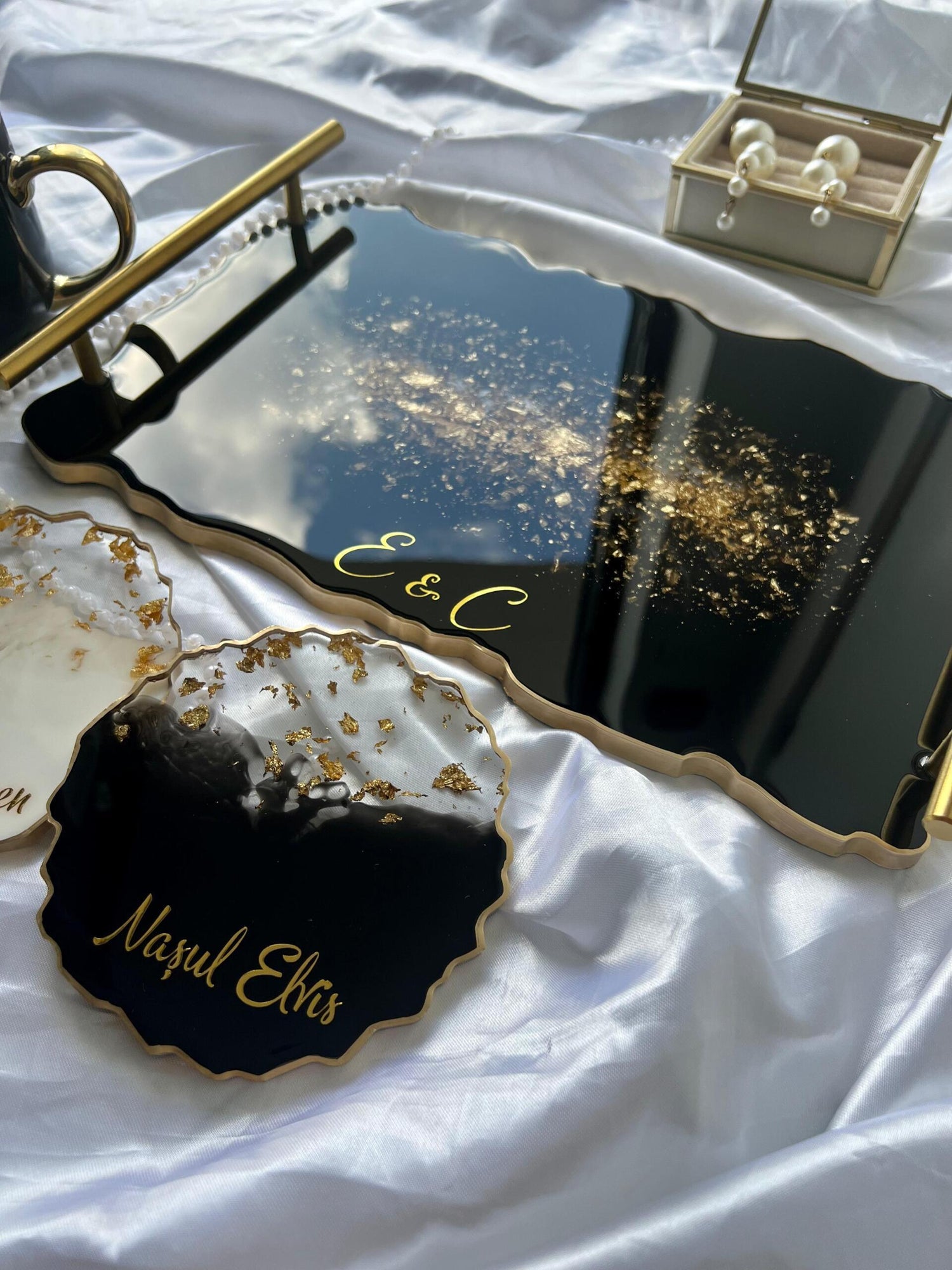 Comandă simplu prin Instagram, Facebook sau WhatsApp, iar această tăviță din rășină cu foiță de aur va deveni un decor memorabil sau un cadou de impact, realizat cu atenție, pentru cei dragi sau pentru tine.